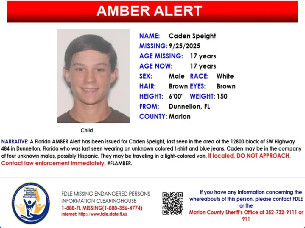 Un adolescente de Florida fue arrestado por haber orquestado un elaborado engaño en el que fingió su propio secuestro e incluso se disparó en la pierna para hacer parecer creíble la historia. Caden Speight, de 17 años, desapareció el 25 de septiembre en Dunnellon, lo que provocó una búsqueda frenética que incluyó el despliegue de un helicóptero y una Alerta AMBER. Las autoridades encontraron su camioneta abandonada con un agujero de bala en el parabrisas, su teléfono celular gravemente dañado, marcas de arrastre en la tierra y lo que parecía ser sangre, lo que inicialmente apuntaba a un secuestro violento por parte de «cuatro hombres hispanos» en una furgoneta de color claro, según los dramáticos mensajes de texto que Speight envió a su familia.