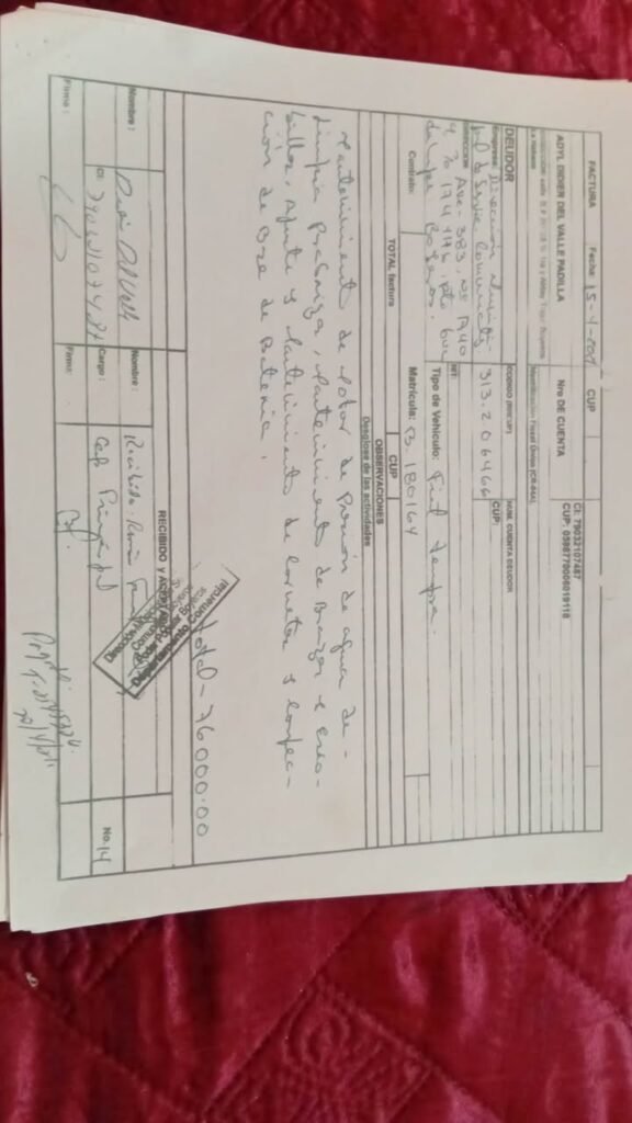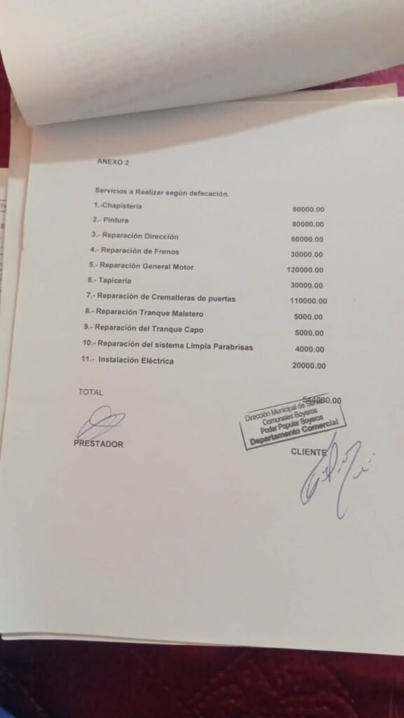 - Pago millonario por reparación de un vehículo ligero: Se habría pagado la suma de 900,000 pesos MN a un cuentapropista identificado como Adyl Didier del Valle (con domicilio en calle 8, El Trigal) por la reparación de un vehículo ligero marca Fiat, matrícula B180164. La denuncia incluye facturas y contrato con la firma de Domínguez como evidencia.