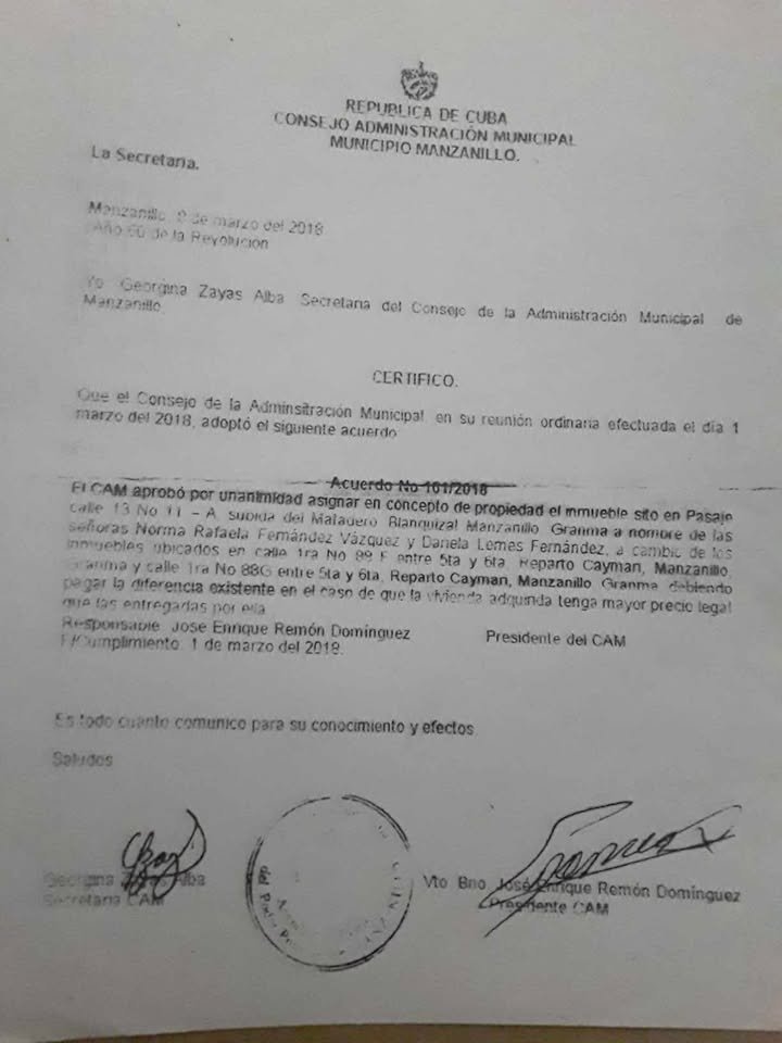 La denunciante ha aportado el Acuerdo No 101/2018 del Consejo de Administración Municipal de Manzanillo, firmado el 1 de marzo de 2018 por el entonces presidente del CAM, José Enrique Remón Domínguez.