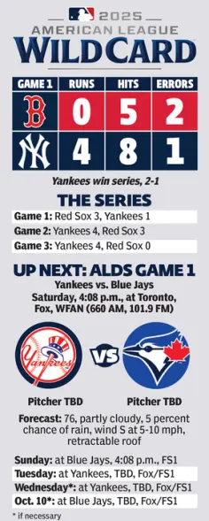 Los Yankees, que tuvieron un récord de 4-9 contra los Medias Rojas durante la temporada regular, comenzarán la Serie Divisional de la Liga Americana el sábado en Toronto, intentando revertir otra temporada regular desigual que fue ganada por los Azulejos 8-5.