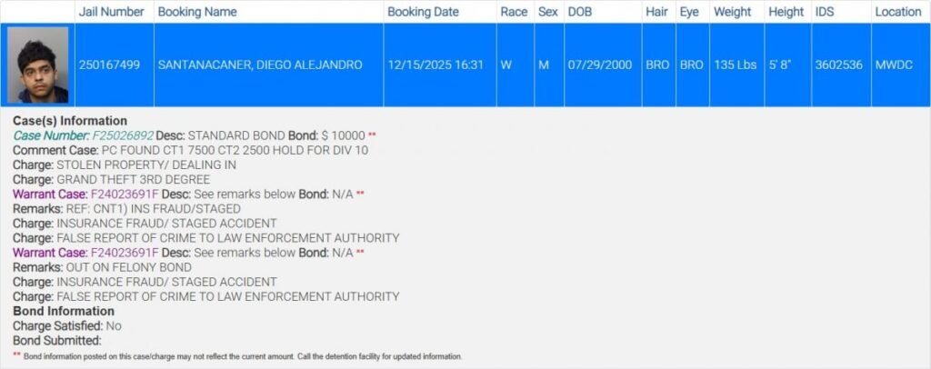 - Situación legal: Permanece detenido en el Centro Correccional Turner Guilford Knight con una fianza de $10,000 por este caso, y también por presunta violación de libertad condicional por un delito anterior de simulación de accidente.