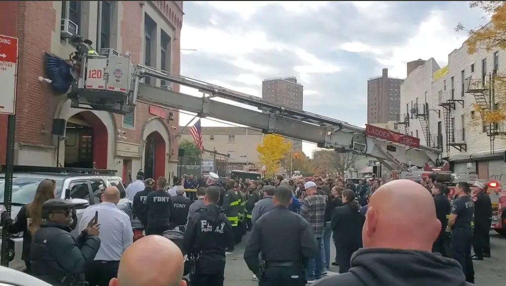 La tradición, presidida por el capellán del departamento Peter Purpura, consistió en colar crespones negros y púrpuras en la fachada del cuartel de la Engine 231/Ladder 120/Battalion 44, un símbolo de luto por la segunda muerte en acto de servicio del FDNY este año. La viuda de Brady, Kara, y sus dos hermanos, Jimmy y Brian, también bomberos, lloraron abiertamente durante el homenaje.