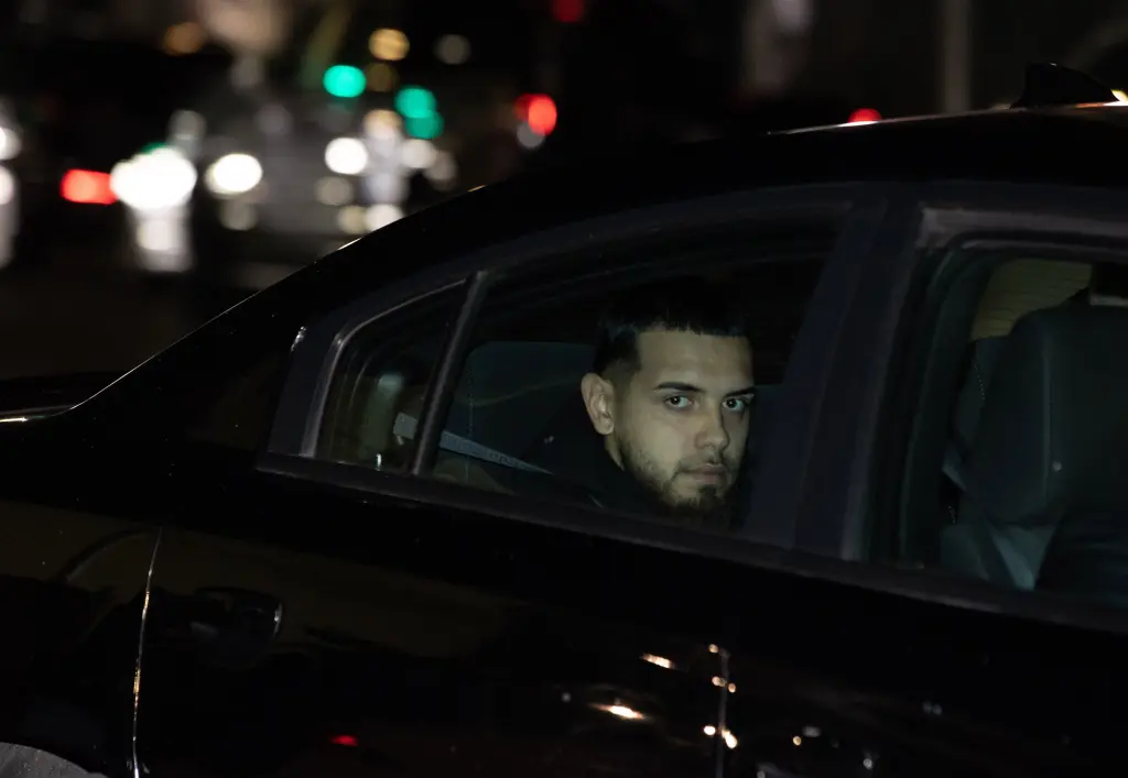 Al ser escoltado fuera de la comisaría, Aguilera bajó la cabeza y lanzó miradas desafiantes a los fotógrafos y periodistas.
