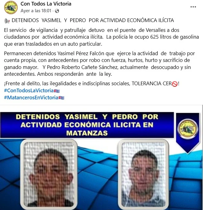 Dos ciudadanos cubanos, Yasimel Pérez Falcón y Pedro Roberto Cañete Sánchez, fueron detenidos en la ciudad de Matanzas acusados de «actividad económica ilícita» luego de que las autoridades les ocuparan 625 litros de gasolina que transportaban en un auto particular.