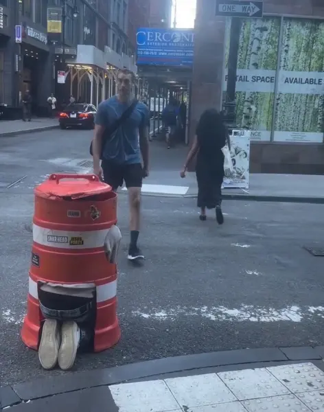 En el video, difundido inicialmente en Instagram y con más de un millón de «me gusta», se observa a Coneman escondido dentro de un cono de tráfico naranja en el Distrito Financiero. En el momento en que un hombre —vestido con ropa deportiva y de complexión atlética— pasa cerca, el bromista salta abruptamente gritándole.