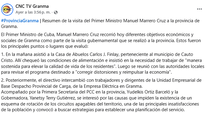 La reciente visita del Primer Ministro Manuel Marrero a la provincia de Granma constituye un estudio de caso emblemático sobre la brecha existente entre el discurso oficial y la realidad cotidiana que enfrentan los cubanos. Durante su recorrido por instalaciones económicas y sociales en Bayamo y otros municipios, el alto funcionario empleó una retórica cargada de expresiones como «pueblo guapo y faja’o» y «luchar junto al Partido», mientras las soluciones concretas a problemas críticos brillaron por su ausencia.